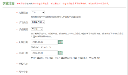 填写学信网学生档案中的学籍学历信息,如果对学籍信息有疑问,请登录学信网查看确认如果学业信息审核不通过,请咨询学校或武装部修改。核验通过后将不能更改,核验时间为一个工作日。