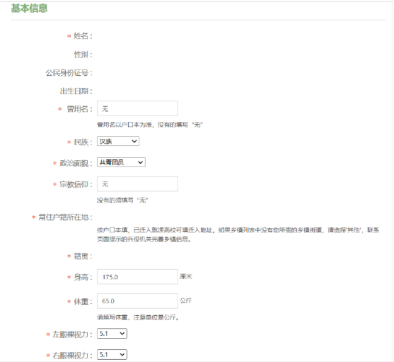 姓名、身份证号码等系统自动填写,剩下的民族、宗教信仰、政治面貌、家庭住址、联系方式等等信息,如实填写即可。身高、体重、视力可先自行测量,填写最为接近真实水平的数据即可,最终以正式体检的结果为准。