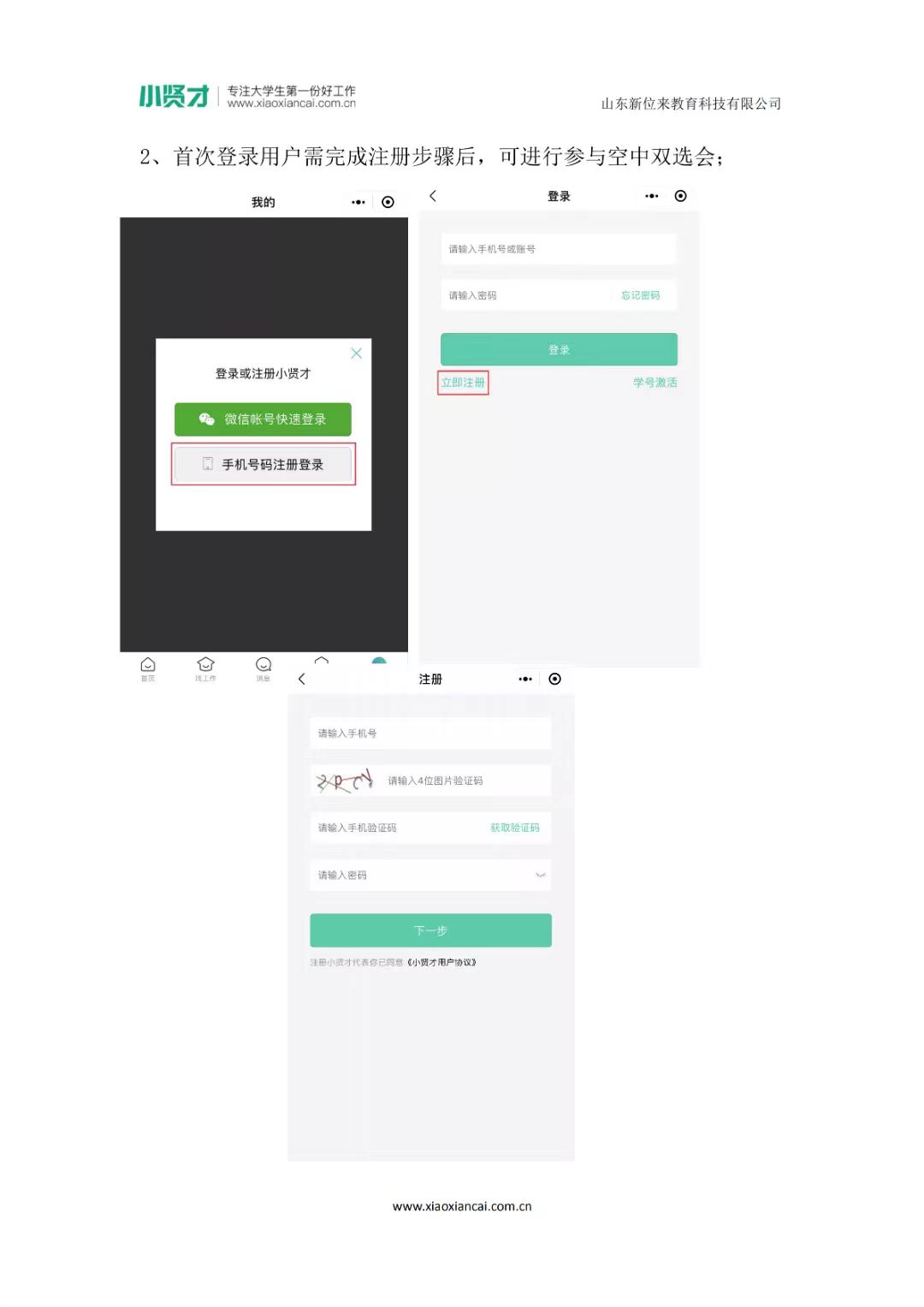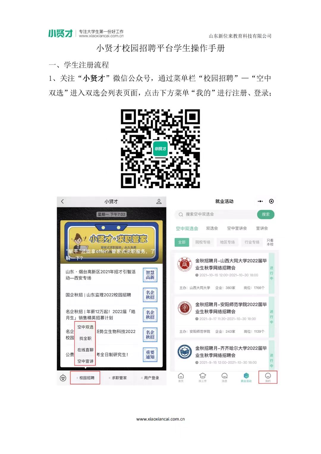 1.关注“小贤才”微信公众号,点击“用户登录—学生入口”,进入学生页面,点击“个人中心—注册”(学生注册流程见附件2)。