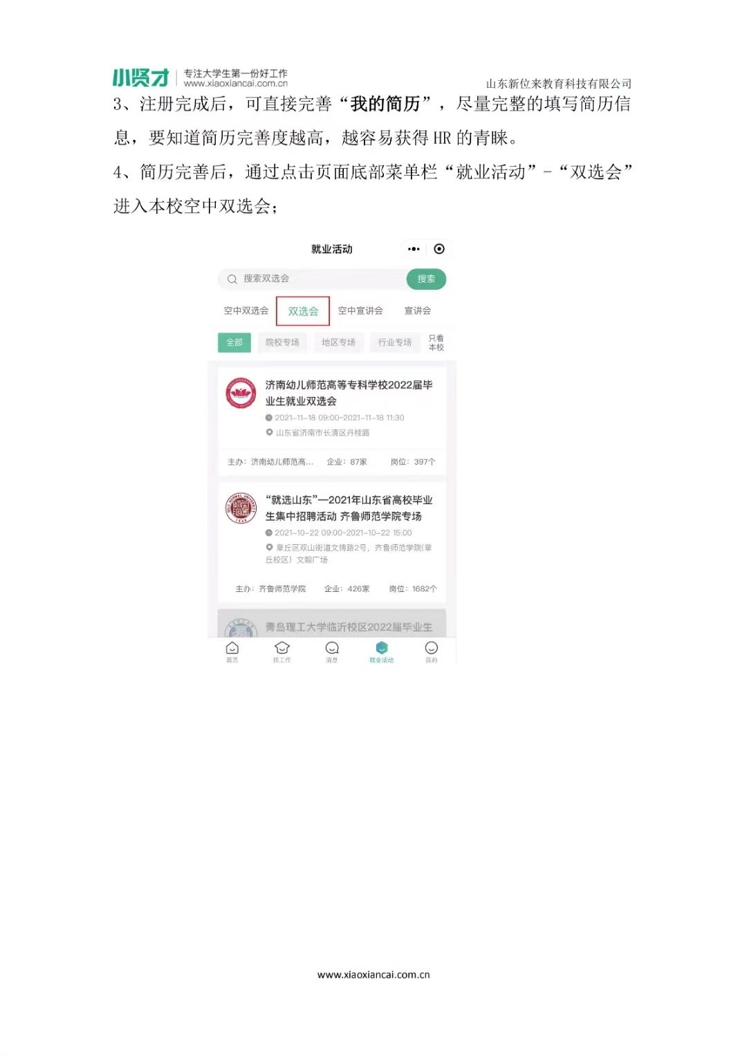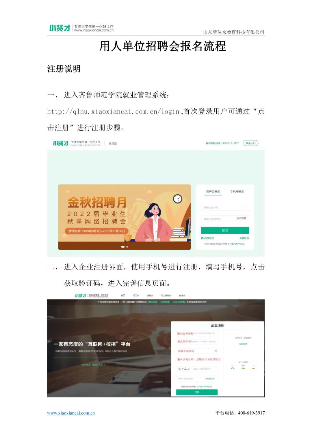 1.本次双选会采用网上报名模式。参会单位通过报名入口:http://qlnu.xiaoxiancai.com.cn/login进行注册、报名并发布招聘岗位。我们将审核确定参加本次双选会的单位名单,并通过平台反馈。