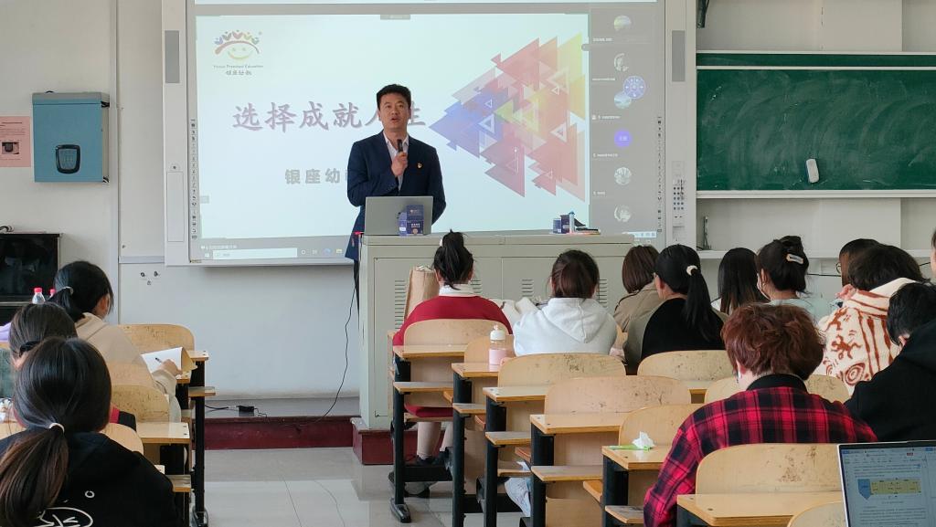 山东银座·英才幼儿园园长刘勇介绍了该园的发展、办学特色、岗位职责、职业发展等情况,详细全面的分析了学前教育专业的发展优势和就业前景。