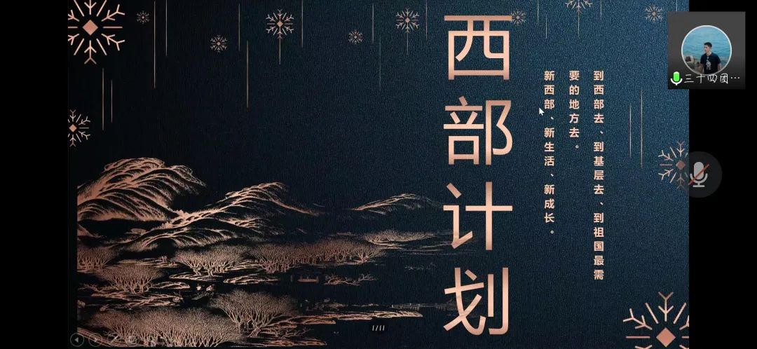 会议由目前仍扎根于西部服务20届毕业生宋佳音、21届毕业生孙浩然,从服务期限、政策保障、报名要求、自身经历等方面给毕业生答疑解惑。孙浩然与毕业生们分享了基层工作的服务感受、生活待遇问题及西部的壮美景色;宋佳音具有针对性地解答了毕业生们的疑惑,并详细介绍了岗前培训过程与岗位分配情况。他们以自身经历鼓励毕业生积极报名西部计划,号召大家“用一年不长的时间做一件终身难忘的事”。