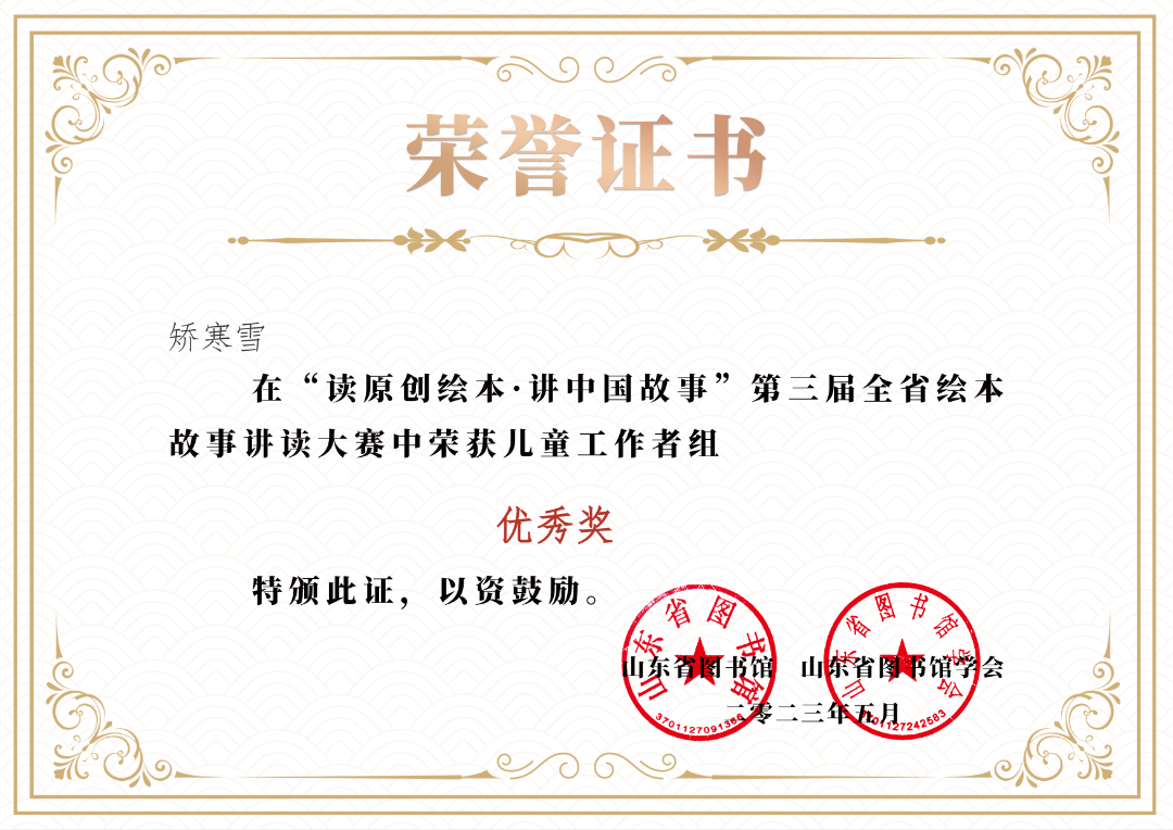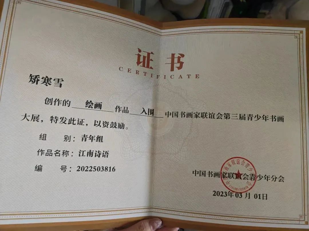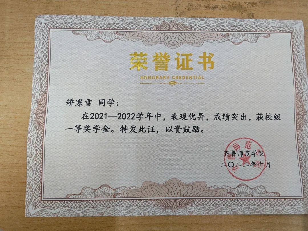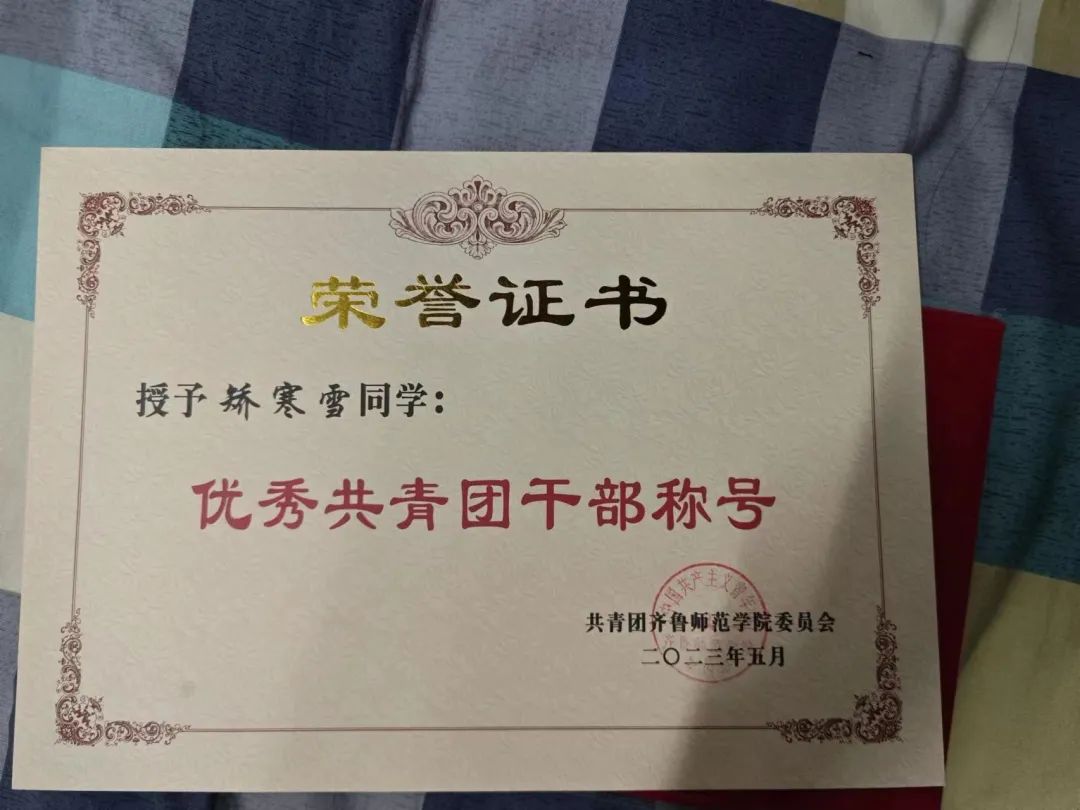 矫寒雪,女,汉族,中共预备党员,学前教育专业,现任班级宣传委员,获得两次校级一等奖学金,校级优秀团干部,中国书画家联谊会第三届青少年艺术大展 三等奖,“读原创绘本 讲中国故事”第三届山东省绘本故事讲读大赛优秀奖;全国高校商业精英挑战赛创新创业竞赛商务会奖旅游赛道山东省总决赛三等奖等多项荣誉。