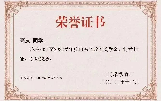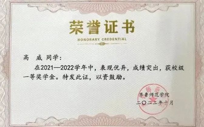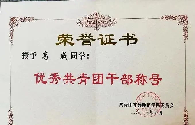 作为一名中共预备党员,高威始终以“有我”的担当,怀青年的热血,全力答好新时代的青春之问。“勤勤恳恳,脚踏实地”是他对待学习的热忱。他勤奋笃学,成绩优异,专业能力突出,综合成绩位于专业前列,连续两年获得校级一等奖学金,2022年获得山东省政府奖学金。“乐于奉献,踏实负责”是他服务同学的宗旨。入学以来,他便担任团支书一职,先后被评为“校级五四优秀团干部”“校级优秀学生”;与其他班委紧密配合,做好班风建设,所在班集体荣获“校级先进班集体”。