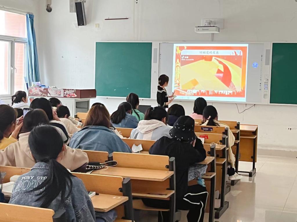 此次活动共分为四个模块。一是由庄宿敏同学带领大家了解认识党的二十大的相关知识,帮助同学们较为清晰地了解了中国共产党第二十次全国代表大会的由来和意义,进一步了解了我国“两个一百年”奋斗目标;二是由郑芙蓉同学带领同学们共同观看“党的百年发展史”视频,同学们积极踊跃发言分享自己观后感悟,更加深刻地认识到了党的百年历程与辉煌;三是组织了党史知识竞答活动,全班共分为六个小组,以小组为单位开展竞答活动,使同学们即了解了党史知识,又增强了团队意识;四是由张蕾同学作“青春心向党,奋斗自芳华”主题演讲,阐述了新时代青年的责任与担当,表达了对党组织的敬仰与向往,展现了青年一代踔厉奋发,笃行不怠的信心与决心。
