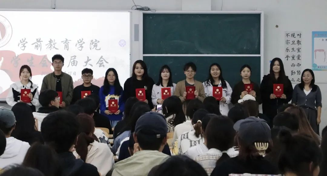 大会第三项,孙建凯为第二届主席团成员颁发聘书,郭飞为第二届学生会主要学生干部颁发聘书。振奋人心的颁奖、沉甸甸的红皮聘书给予大家在学生会工作辛勤付出的肯定。