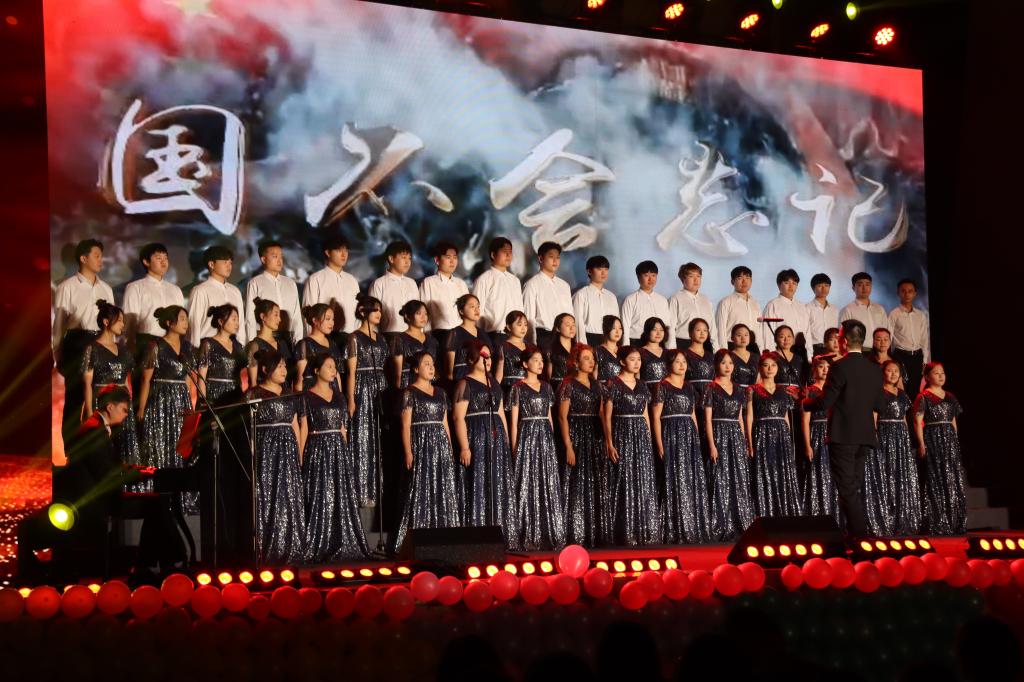 我院糖果合唱队整齐着装,礼服靓丽夺目,歌声气贯长虹,在全场悠悠回荡,最佳指挥阎凯老师的手势在空中铿锵有力地挥舞,合唱队员们伴着指挥意气风发、斗志昂扬,坚毅的目光望向前方,努力用青春最灿烂的美好、最热血的激情为党和祖国献礼,那是对党、对国家的忠诚与热爱!