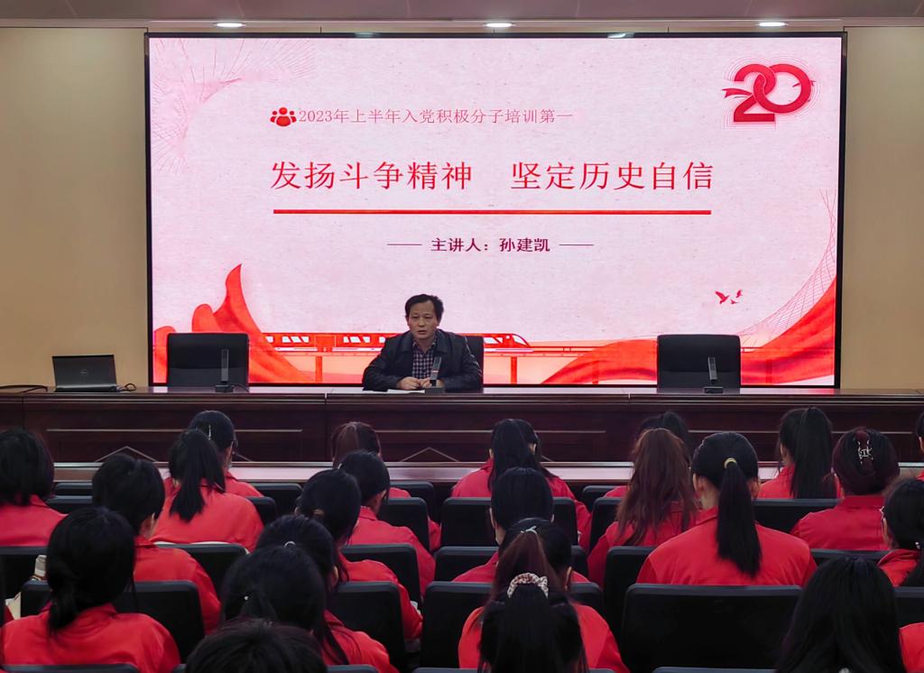 仪式后,孙建凯以“发扬斗争精神,坚定历史自信”为题作开班辅导报告。他以习近平总书记在党的二十大报告中提出的“三个务必”中的“务必敢于斗争、善于斗争”为切入点,从斗争精神的两个重要渊源、争精神在不同历史阶段的时代特征和丰富内涵、正确认识具有许多新的历史特点的伟大斗争、敢于善于依靠顽强斗争开创新天地等四个方面进行了解读。勉励入党积极分子牢记总书记嘱托,牢记时代责任与历史使命,发扬斗争精神,敢想敢为又善作善成,立志做有理想、敢担当、能吃苦、肯奋斗的新时代好青年,勇担中华民族伟大复兴大任。