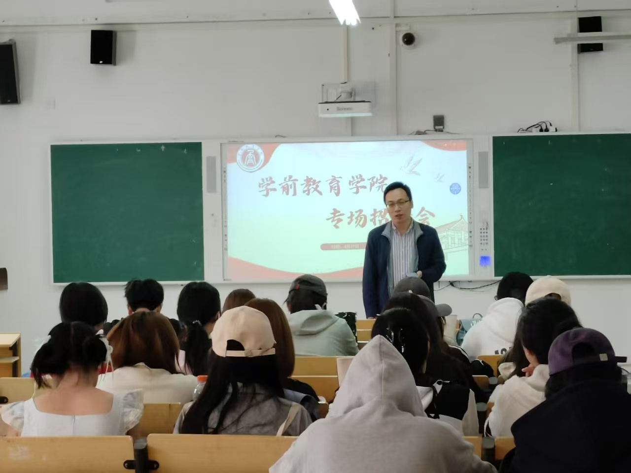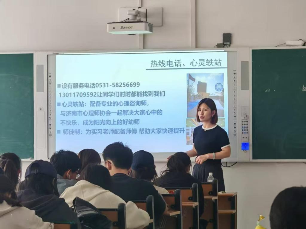 在招聘会宣讲环节中山东优师教育集团的两位老师带来了深度的分享,首先讲解了线上兼职教练说明会(AI智能型在线训练平台),此平台以“优质陪伴,极致服务”为宗旨,构建“AI智能系统+真人教练”双轨服务模式,通过大数据分析儿童发展轨迹,匹配个性化训练方案,同时依托真人教练实时互动,填补智能教育情感陪伴缺口。开放了“在线教练”“课程顾问”等岗位,为学生提供灵活就业的渠道。随后第二位老师为学子们揭开了职业选择的“全景式分享”,从机构概况到能力要求,全方位搭建职业认知框架。打开学生学习认知的新篇章。两位老师的讲解,既展示了教育行业的拓展业务,也理清了职业发展的具体路径,让同学们在接触专业前沿的同时,也能明确务实的规划方向,实现对行业认知的提升。
