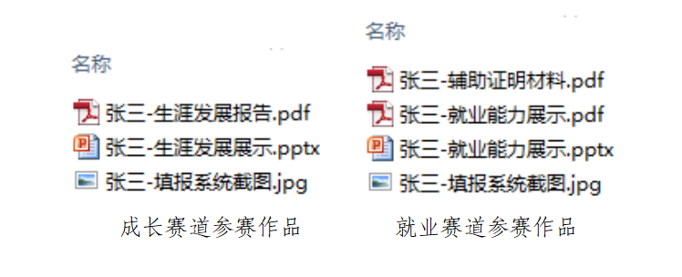 3、每个选手的【参赛作品(按三、大赛内容整理)、填报系统的截图】放在文件夹中,单个命名如下: