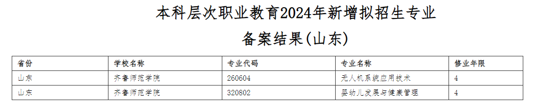 近日,教育部发布《关于公布2024年本科层次职业教育拟招生专业设置备案结果的通知》(教职成厅函〔2024〕11 号),公布了今年新增的拟招生职业本科专业。太阳成集团tyc234cc无人机系统应用技术、婴幼儿发展与健康管理2个专业成功获批。