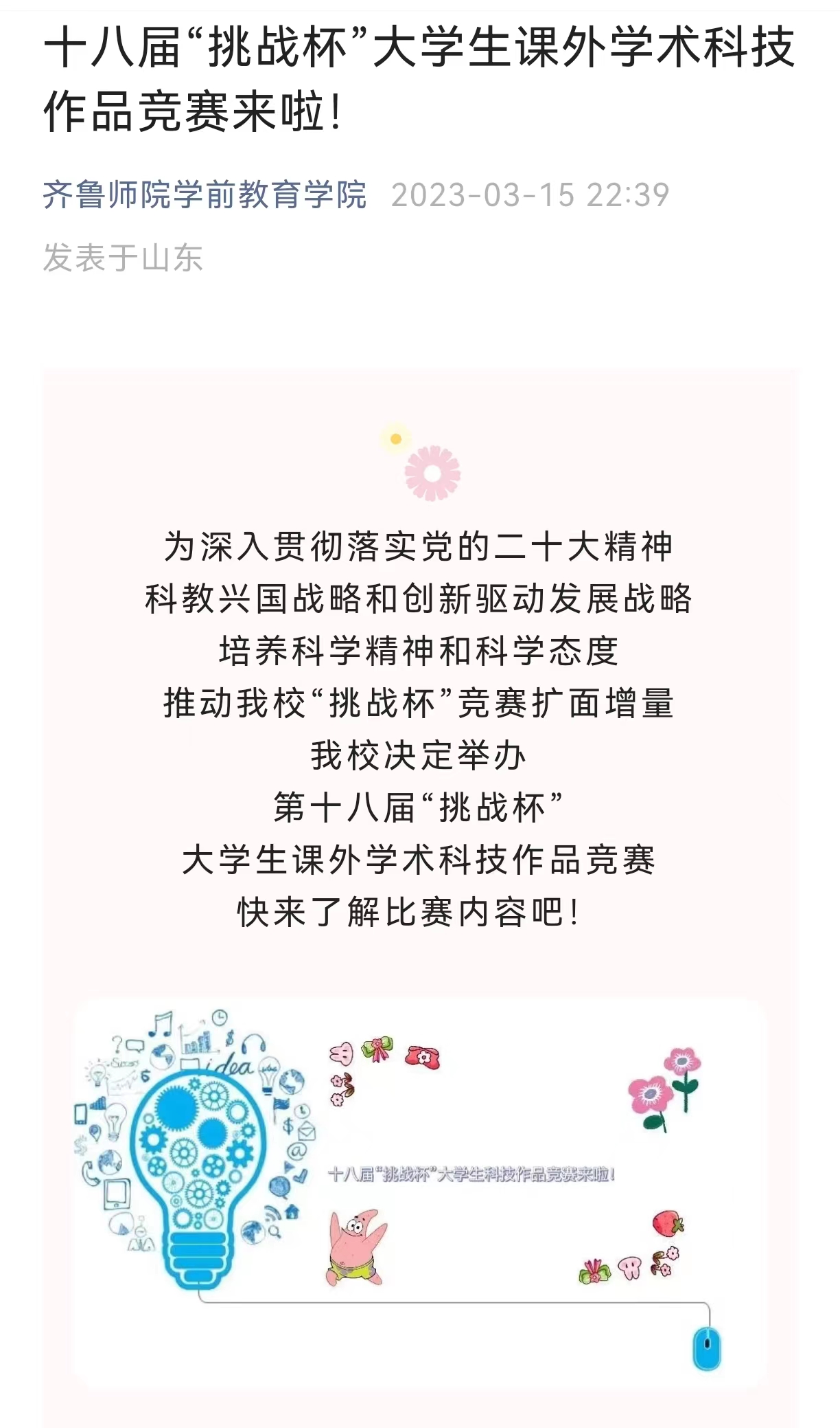 学院积极组织开展第十八届“挑战杯”大学生课外学术科技作品竞赛。此次“挑战杯”竞赛兼具互动性、体验性和科技亮点,激励广大青年学子用实际行动诠释新时代雷锋精神的同时,进一步展现了学前学子积极奋斗、敢于创新、不断创新的精神,在实践过程中不断开拓进取、绽放时代光芒。